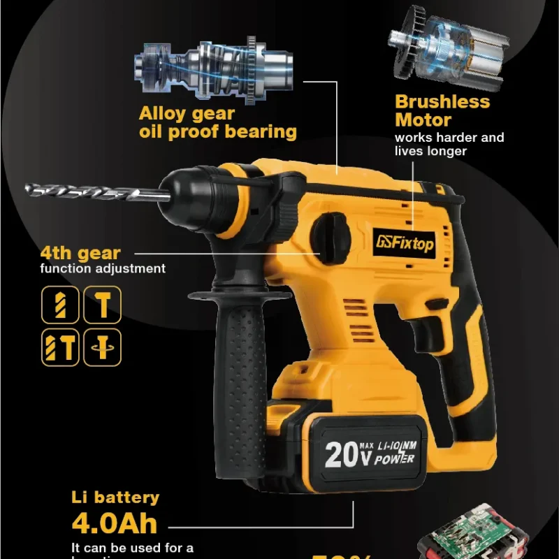 Battery voltage: 20V Battery capacity: 4.0/6.0Ah No-load speed: 0-1400r/min Shock frequency: 0-4500spm/min Maximum drilling: 20mm